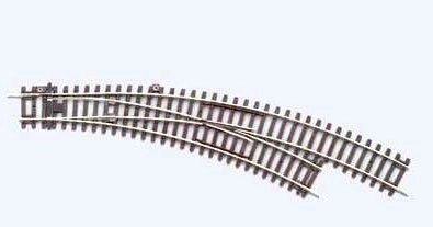 Piko curved switch with detailed reproduction of wooden sleepers and authentic colors. This switch combines a pair of 30° curves R3 and R2 for right direction and can be operated manually or with remote control.