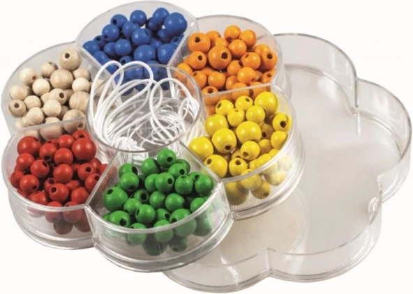 Discover playful creativity with DETOA wooden beads in a practical flower-shaped box. The set includes various sizes and colors of beads and elastic threading cords, making beading easy and fun. It supports fine motor skills, creativity, and children's concentration. Suitable from 3 years and meets EU safety standards.