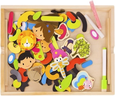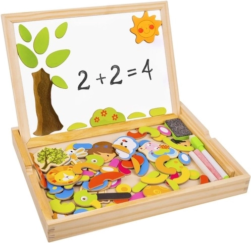 Bring your children hours of fun and creative learning with this wooden magnetic board! The board offers two sides: black for drawing with chalk and white for writing with a marker or arranging magnetic images. Thanks to the example brochure, children can create different patterns and motifs.