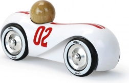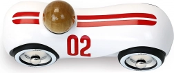 Stylish white racing car made of lacquered wood with metal, rubberized wheels, ideal for little racers and as a design decoration. Made with care in France, it offers a smooth ride, durable construction, and a timeless vintage design.