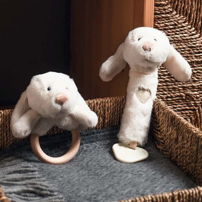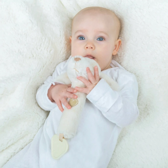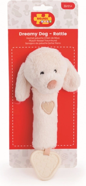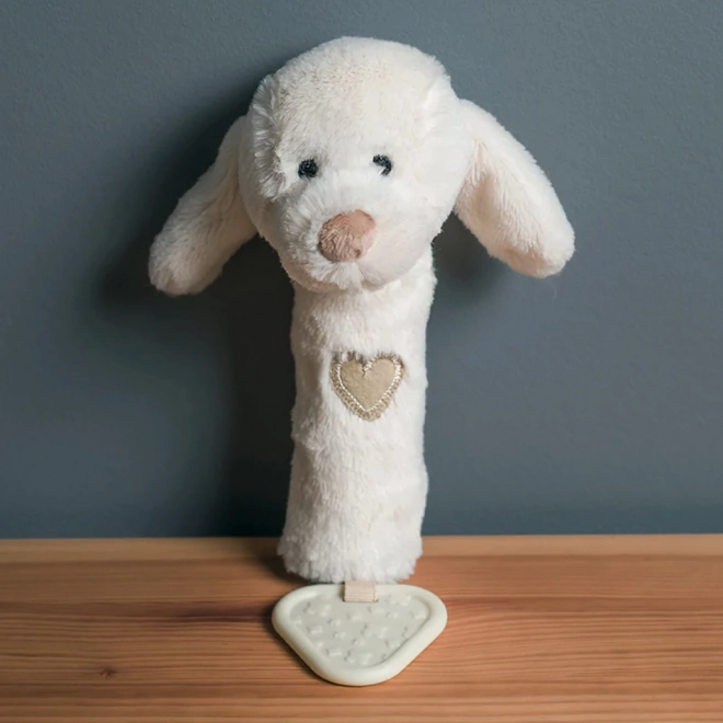 This versatile soft dog toy offers three experiences in one: gentle rattling to stimulate hearing, a fun squeak when pressed, and a textured teether for relief from emerging teeth. The neutral natural tone suits any baby kit.