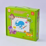 This innovative product combines two amazing worlds: puzzle and water painting. Assembly is made easy with sturdy cardboard boards featuring engraved outlines, while on the other side, kids discover their creativity with water painting. The white layers vanish to reveal vibrant colors that will captivate every little artist.
