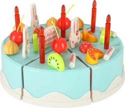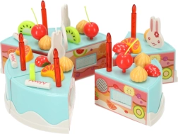 Brighten up a kids' party with this blue cut-and-serve birthday cake – a 75-piece set filled with fruit, candles, and accessories for pretend pastry-chef play. With hook-and-loop connections, children can easily slice and reassemble the cake, decorate as they wish, and practice fine motor and social skills. Made of safe ABS plastic, suitable from age 3.