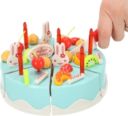 This colorful set with a blue birthday cake is ideal for pretend parties and a kids' kitchen. The cake consists of 6 pieces joined with hook-and-loop, so children can slice it with the included plastic knife, rearrange it, and decorate again. The plentiful accessories – from candles and fruit to cute bunnies and a 'Happy Birthday' sign – nurture creativity and imagination.