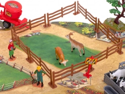 Cow, bull, sheep, goat and other accessories, plus farmer figures and fence pieces for creating paddocks. Complete equipment for realistic play.