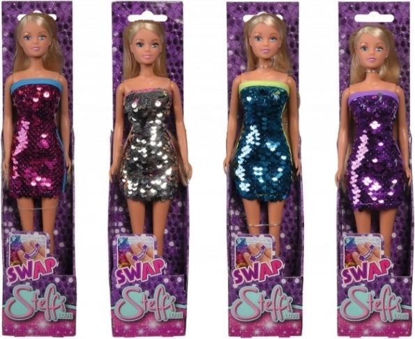 Steffi doll in a dress made of colorful sequins with a swap effect. Size 29 cm.