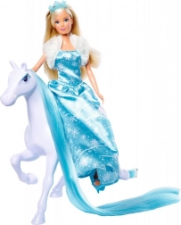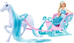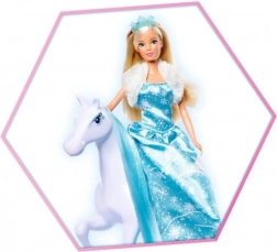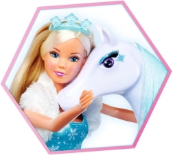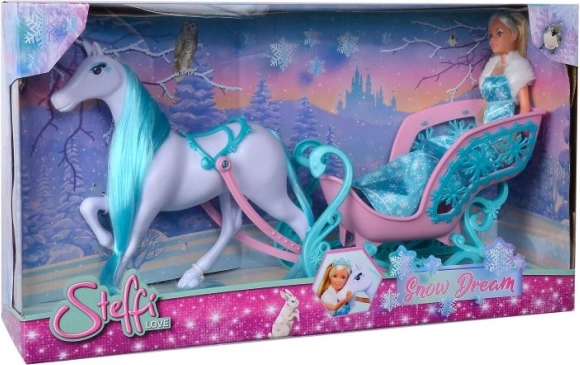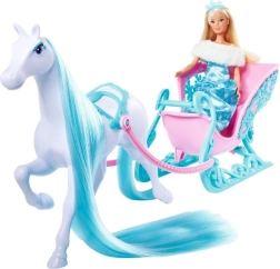Embark on a magical journey with the Steffi doll set as an ice princess. This beautiful set includes a white horse with a long turquoise mane and pink, decorated sleigh for a perfect winter atmosphere. Steffi doll is dressed in a blue dress with snowflake motifs and a tiara, ready for adventures in the winter kingdom.
