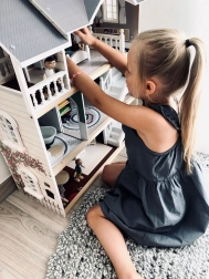 Step into a world of imagination with a spacious dollhouse offering three floors full of fun. Thanks to the open front, several children can play at once, ensuring endless hours of entertainment. The dollhouse is equipped with cozy rooms including a dining room, living room, kids’ room, bathroom, and bedroom.