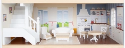 The dollhouse features a bright exterior facade, modern design, and functional elements such as sliding doors and opening windows.