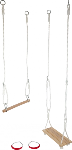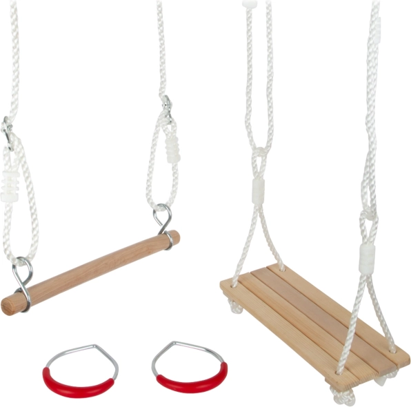 Enjoy triple the fun with the versatile 3-in-1 wooden swing from SMALL FOOT. The set includes a classic swing, a trapeze bar, and gymnastic rings with plastic handles. Thanks to 4 weather-resistant adjustable ropes, you can easily set the height, and with two rope sets you can use two swings at the same time. Easy hanging, quality materials, and a load capacity up to 100 kg ensure safe fun at home and in the garden.