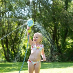 You can place the sprinkler freely on the ground, hold it in hand, or easily attach it to any compatible garden playhouse.