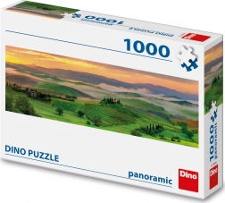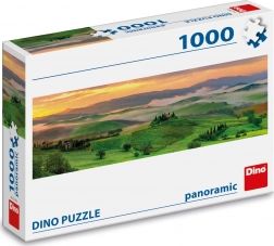 Enjoy a relaxing time assembling a panoramic puzzle featuring a misty sunset over green hills. High-quality Czech-made DINO, precise cuts, and 1000 pieces for a pleasant challenge. Durable health-safe cardboard, panoramic format, and an image ideal for framing after completion.