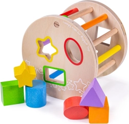 This wooden shape-sorting roller is a great choice for a first educational toy. Colorful geometric pieces fit into matching openings, helping children practice logical thinking, patience, and precise grip. When rolled across the floor, the toy makes pleasant clacking sounds that encourage further exploration.