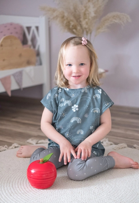 Smooth, sturdy wooden pieces in bright colors complemented by a felt leaf. Pleasant to the touch, safe, and ready for frequent play.