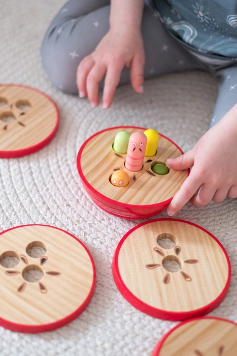 This clever apple puzzle invites children to stack the layers so that the number of holes in the layer matches the number of worms currently peeking out from the base. Each worm has a different height, so kids naturally practice logic, patience, and distinguishing shapes and sizes.