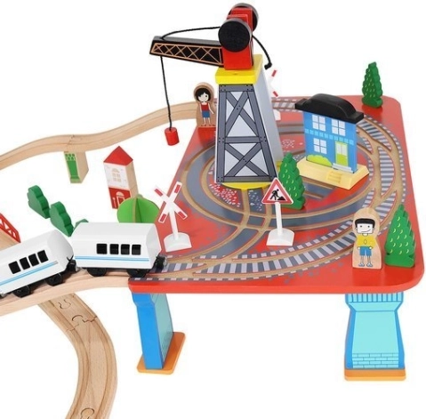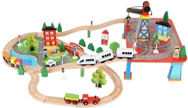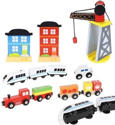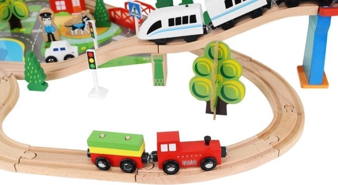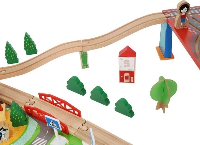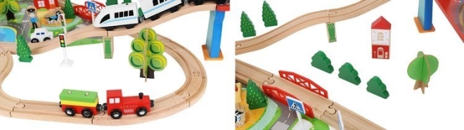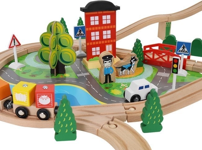 Wooden train set with a total of 88 precisely crafted pieces, including tracks, freight and passenger trains, car, trees, and traffic signs. The fun is in the ability to create your own route, while the magnetic connections ensure easy operation.