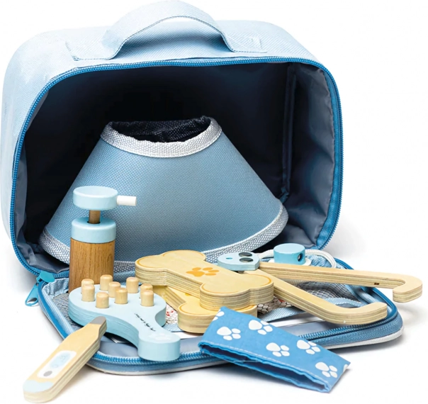 The complete veterinary case lets children care for plush toys and pet figures like a real doctor. The set includes tools such as a stethoscope, thermometer, otoscope, syringe, bandage, brush, protective collar, and other accessories. Everything is stored in a durable fabric bag with a paw print, ideal for carrying and storage.