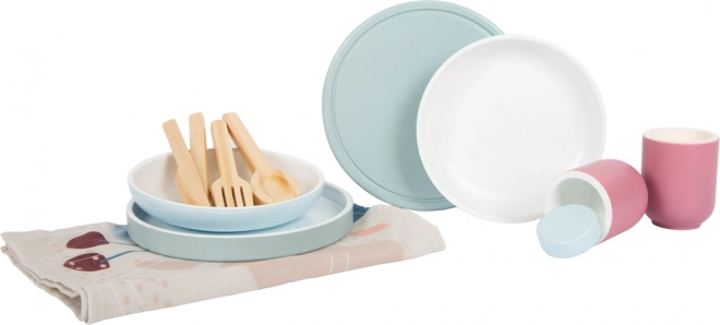 The Children's Dining Set Tasty by Small Foot brings a modern design combining natural wood with smoky blue and berry red colors to your home. This set includes plates, cups, cutlery, and placemats for two people, ideal for young chefs who want to learn proper dining etiquette.