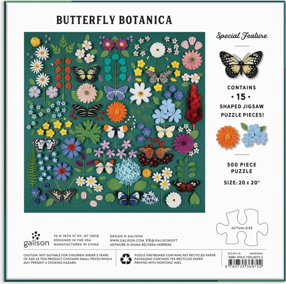 The Butterfly Botanica puzzle brings joy to all lovers of nature and cozy relaxation. The rich botanical illustration with radiant butterflies and flowers shines once completed in a 50.8 × 50.8 cm format. Thanks to 15 uniquely shaped pieces, assembling is even more entertaining and visually captivating.