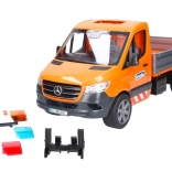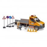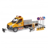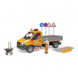 A finely detailed Mercedes‑Benz Sprinter road maintenance model by BRUDER brings light and sound effects, a tipping bed with folding side panels, and rich accessories for realistic play. Includes a road worker figure, loading ramps, signs, and cones. High‑quality ABS plastic, scale 1:16, made in Germany.