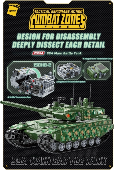 Build the iconic Chinese 99A tank from 2,743 pieces and uncover its secrets thanks to the easily accessible interior, fully rotating turret, and independently sprung suspension. A unique highlight is the large 150HB-2 power unit model, which lets you explore construction details. Qman bricks are compatible with other brands and made from durable ABS plastic.
