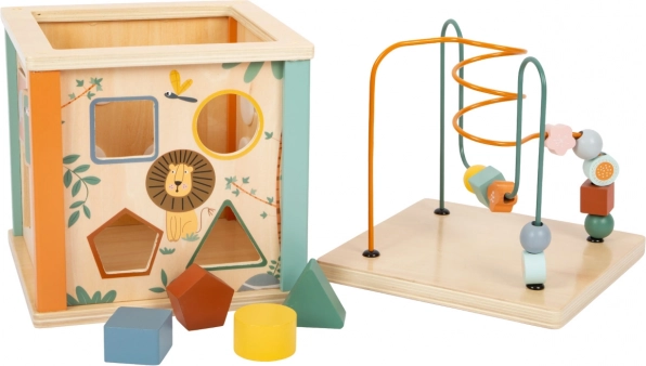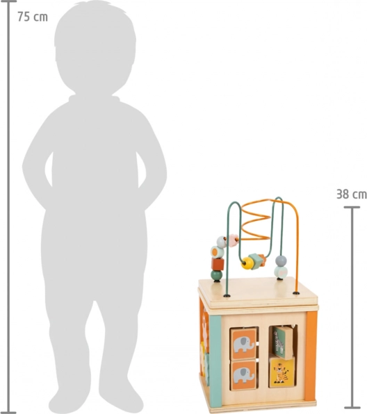 Immerse yourself in various activities with the wooden Safari Activity Cube for children. With a vibrant combination of sliding and bead mazes, spinning blocks, gear wheels, and inserts, your child will enjoy hours of fun while developing their skills. Adorned with safari animal motifs, this cube is a great toy for all curious kids.