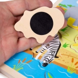 This wooden puzzle game Safari is designed for the youngest children to help them develop their cognitive skills. Placing the correct piece will play a unique animal sound, making learning and fun simultaneous. The pieces are adapted to small children's hands with their size and smooth shapes, which are pleasant to touch.