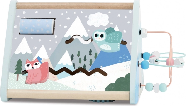 This wooden toy with a winter realm theme includes several activities that will help your child develop their abilities: