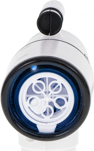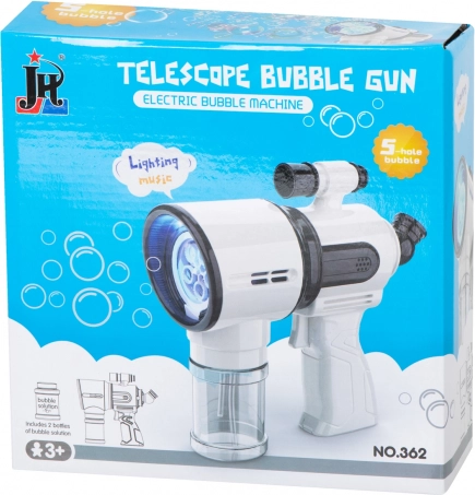 This white bubble gun is ideal for kids aged 3+ and family outdoor events. The integrated fan and 5-ring system ensure smooth blowing and a stream of dozens to hundreds of bubbles with one trigger press. For extra fun, there’s LED lighting and sound that can be toggled with a single button.