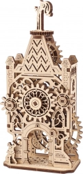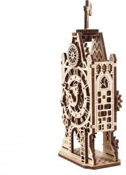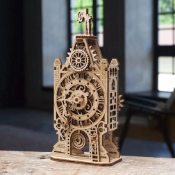 This precisely crafted 3D mechanical kit made of natural plywood is not only decorative but also educational. By turning the large wheel, you set in motion the asynchronous transmission of the clock hands, the pendulum, the weathervane, and other architectural details. The well-thought-out mechanics provide smooth motion and clearly demonstrate how basic clock mechanisms work.