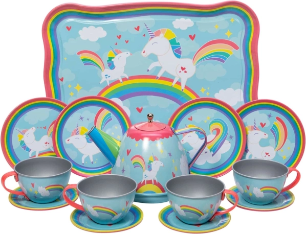 This magical unicorn-design tea set brings lots of imagination and joy to any kids’ room. The metal construction is lightweight yet durable, making it ideal for everyday play. Children can serve tea to friends, dolls, and plush toys while practicing fine motor skills and social behavior.