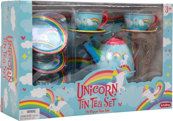 An adorable unicorn-themed tea set will delight little hosts and hostesses. It includes 15 pieces made of durable metal—cups, saucers, plates, a teapot with lid, and a serving tray 24 × 16 cm. Perfect for pretend tea parties and fostering creativity and social skills. Suitable for children ages 3+.