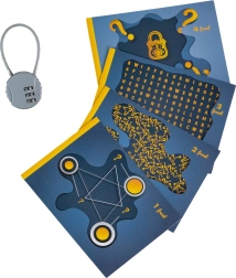 An original way to wrap a small gift that combines surprise with a puzzle. Easily turn a cardboard box into a personal escape challenge: simply assemble it, lock it with a three-digit code of your choice, and use the included cards to create step-by-step clues. Includes 4 hint cards, a combination lock, 3 sheets of stickers, and 5 tags for creative gift customization.