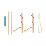 - 1× base, 2× rod, 2× chopsticks, 4× silicone bowl, 10× wooden bead, 12× fish, 17× caterpillar, 1× die, 16× pawn in 4 colors, 1× tweezers