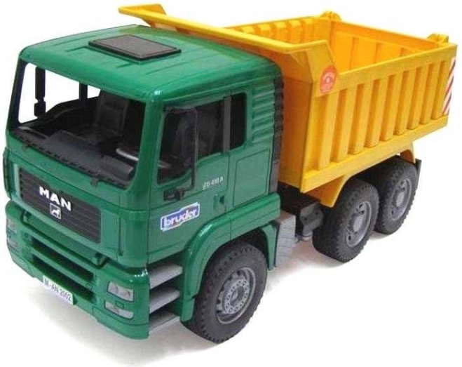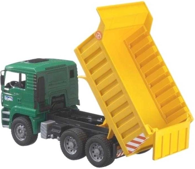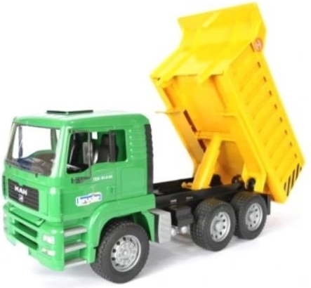 A fully functional plastic model, the BRUDER MAN dump truck in 1:16 scale, is a great choice for all kids who love construction sites and realistic play. The cab tilts to reveal a detailed engine, the exterior mirrors fold, and the bed lifts easily to unload loose materials.