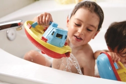The boat has an eye-catching red-yellow-blue design and is perfect for water play, making it an ideal accessory for children's bath time.