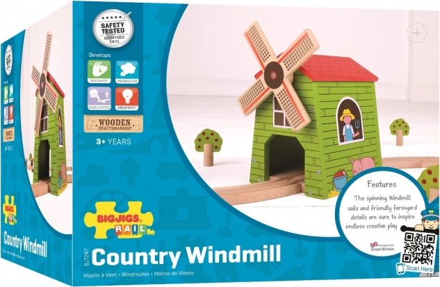 Expand your wooden railway with an interactive windmill from Bigjigs Rail. Children can drive the train through the mill and spin the moving blades, developing imagination, fine motor skills, and coordination. Compatible with most wooden train sets on the market, made from quality wood, and meets European safety standards. Train and additional accessories are not included.