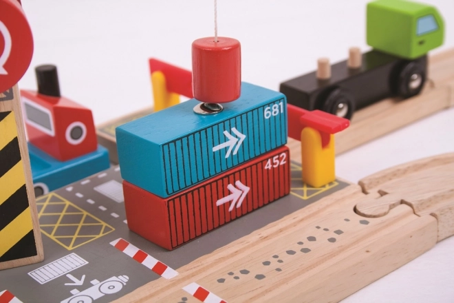 Discover a fantastic wooden terminal with a functional magnetic crane that brings the world of ports and railways closer to children. The set includes a wooden freight truck with containers and a robust crane for easy loading and unloading. The entire design is safe, durable, and invites open-ended play.