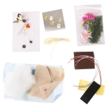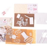 The box includes everything you need: room construction parts, furnishing and decoration elements, glue, and a detailed illustrated manual. Lighting is powered by 2× AAA 1.5 V and 3× LR54 1.5 V (batteries not included). Recommended from 8 years. The finished model measures 17.1 × 13 × 11.6 cm; packaging 25 × 18 × 6 cm.