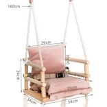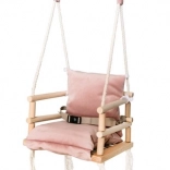 Stylish children's swing for kids from 12 months with soft cushions made of CLEANABOO material that does not absorb liquids. Safe wooden construction with rounded edges, strong ropes, and a safety belt for comfortable, calm indoor swinging.