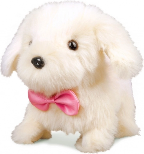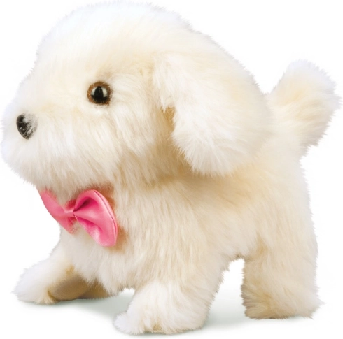 A puppy with an interactive bottle that responds to pressing the button located on its back. When the bottle is placed to the snout, a magnetic sensor makes the puppy produce drinking sounds.