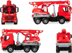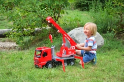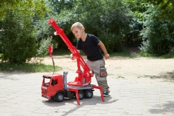 This red MERCEDES ACTROS crane truck by Lena will delight all little builders. Thanks to the rotating boom, working winch and cable, extendable stabilizer legs, and wheel chocks, it offers children authentic and safe play with realistic functions. It is made in the Czech Republic from durable plastic and suitable for both indoor and outdoor use.