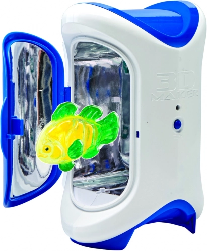 The 3D Maker device uses UV light in a safe chamber with a window, allowing children to safely observe the creation process.