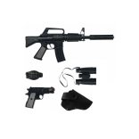 Metal pistol, silencer, binoculars, police badge, pistol holster, police submachine gun