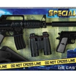 Complete police set for young law enforcers: a metal pistol with silencer, submachine gun, binoculars, badge, and holster. Metal construction, 8-shot caps, and realistic play. Made in Spain.