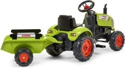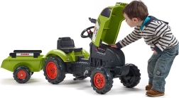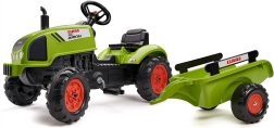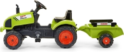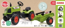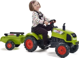 Claas Arion 410 pedal tractor with trailer, tilting hood, exhaust stack, steering wheel, and horn. Made of high-quality, highly durable plastic. Size 138×53×42 cm. Age 2+. All Falk tractors are tested for 30 kg in accordance with European standards. Made in France.