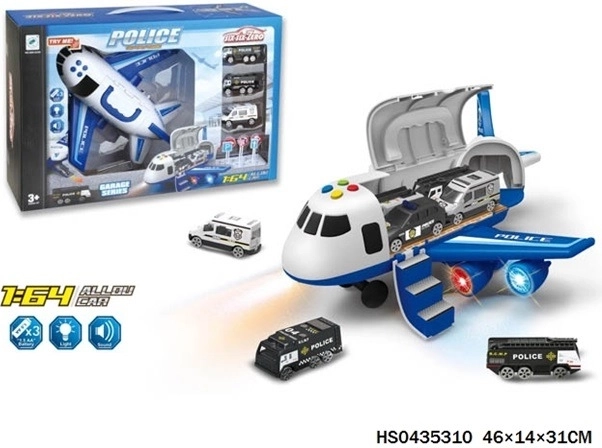 Set out on a rescue mission with a multifunctional toy that combines a police plane and a garage in one. Children will enjoy realistic play thanks to the buttons with lights and sounds and smooth friction-powered movement. The included 1:64 scale metal cars expand play possibilities and spark imagination.