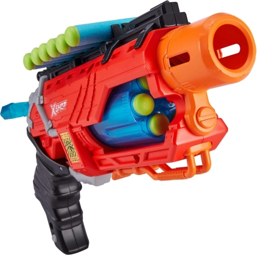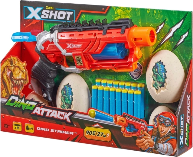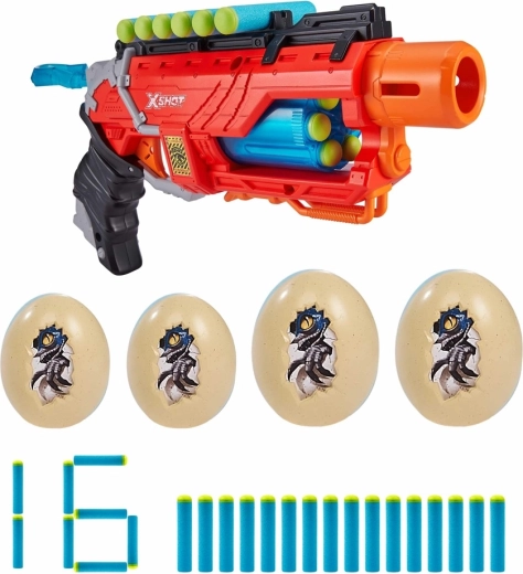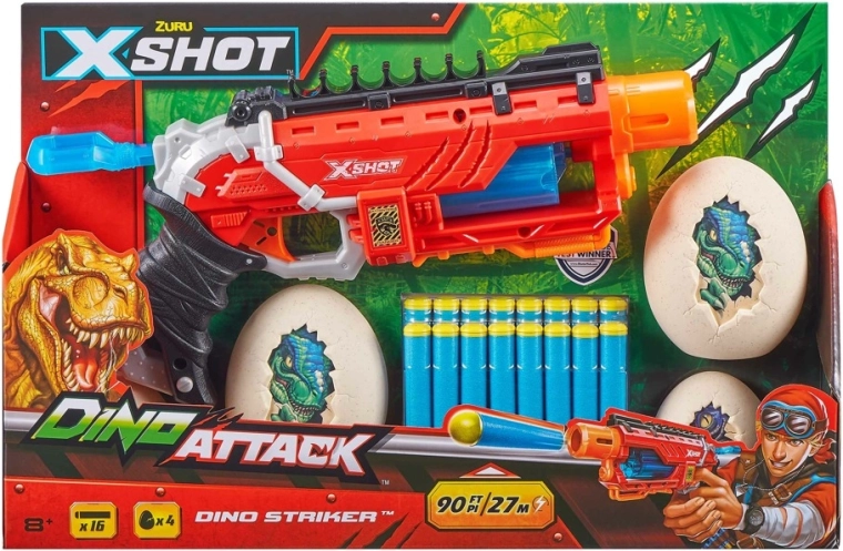 Warning! The dinosaurs are attacking! Destroy their eggs and prevent them from multiplying further. This unique blaster lets you shoot up to a distance of 27 meters. The rotating drum allows rapid fire. Plus, you can attach spare darts to the handy holders on the top of the blaster. The blaster is safe, made of high-quality plastic, and allows accurate shooting. Age: 8+, includes: blaster, 16 darts, and 3 dinosaur eggs.