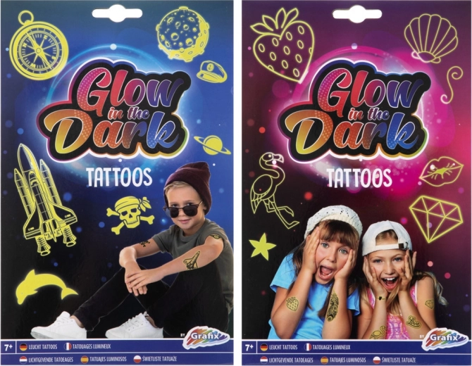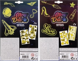 This set of glowing tattoos is ideal for girls who want to add sparkle to their style. Enjoy various designs available in the package, which includes two sheets of tattoos. Simply cut out, place on the skin, dampen with a sponge, and you're done! Application is quick and fun.