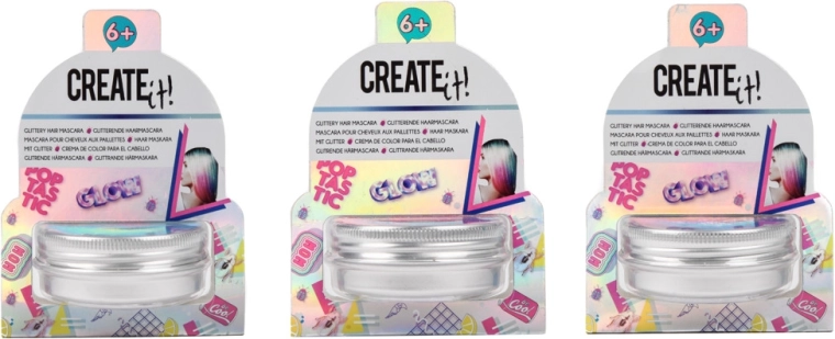 Glow-in-the-dark hair dye in blue/pink, turquoise. Easily washable. Dermatologically tested, meets EU standards.
